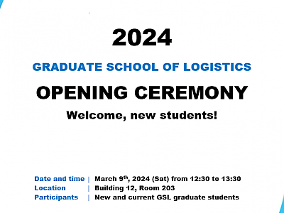 2024.02.15Welcome ceremony for new students of the Graduate School of Logistics in Spring 2024The welcome ceremony for new students for the first half of the 2024 school year was held at the Holiday Inn Incheon Songdo Hotel on February 3, 2024. On this day, many people, including new master's and doctoral students, professors from our graduate school, and members of the alumni association, attended. Academic orientation materials and guidance on using campus facilities will be uploaded to the Graduate School of Logistics bulletin board. If you need access to these materials, please contact us.Event schedule Time Event 12:00 ~ 12:10 Opening 12:10 ~ 12:15 Welcoming speech ■ Song Sang-Hwa Dean of Northeast Asia Graduate School of Logistics 12:15 ~ 12:30 Alumni association ■ Introduction and welcoming remarks by alumni association executives ■ Information on the 2024 alumni association activity plan 12:30 ~12:50 Academic information (course registration and graduation requirements) 12:50 ~ 13:00 Break time 13:00 ~ 14:00 Special lecture ■ “Commerce Logistics Fulfillment Project”