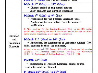 APPLICATION FOR SUPPLEMENTARY KOREAN CLASSES FOR THE 2024-1ST SEMESTER Dear international students,Committed to enhancing the educational experience and facilitating seamless academic integration, we are pleased to announce the commencement of supplementary Korean language classes tailored specifically for international students during the 2024-1 semester.Supported and promoted by various colleges, departments, and graduate schools within our university, these classes aim to empower international students to improve their Korean language proficiency and navigate their academic pursuits with greater ease and confidence. Outlined below are the pertinent details of the program:▷ Program Name: 2024-1st Semester Korean Language Supplementary Classes for International Students▷ Who can apply: International students, including undergraduate, graduate, and exchange students▷ Training Period: April 15, 2024 (Monday) to June 7, 2024 (Friday) / Total Duration: 8 weeks▷ Course Level: Depending on the student's training schedule / level selection▷ Application Period: Until Thursday, March 28, 2024▷ Tuition Fee: Free of charge (however, students are required to procure textbooks individually) ※ How to apply: Google link QR code https://forms.gle/nNXyaF2d2EyYaj8u5 International Education Support Teame-mail: hamhs@inu.ac.krTelephone: 032-835-9855