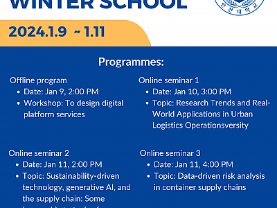 2024.02.152024 Winter School We are really happy to announce that the Graduate School of Logistics (GSL), Incheon National University (INU) will be holding a 'Winter School' for the 2024 winter holiday. A series of guest lectures on SCM and maritime domains are going to be held for three days from January 9 (Wed) to January 11 (Thursday), 2024. We welcome all participants (undergraduate students, graduate students both from INU and outsiders) who are interested in the topic below. Programmes 1. Offline programmes - Date: January 9, 2024, 2:00 PM to 5:00 PM - Instructor: CEO Lee Dong-Seok (Rainmaker) - Location: Lecture Room 212, Building 15 - Workshop contents: To design digital logistics platform services, (1) survey the current status of digital logistics platforms, (2) review the direction of digital logistics platform design, and (3) complete a digital logistics platform service plan during the workshop. * Prior study is required. - Please watch three videos related to service planning from the BK Education Research Team's online curriculum on cyber.inu in advance. 2. Online programmes 2.1. Online Seminar 1 - Date: Wednesday, January 10, 2024, 3:00 PM to 5:00 PM (Korea local Time) - Speaker: Professor Lau, Hoong Chuin (Singapore Management University) - Title: Research Trends and Real-World Applications in Urban Logistics Operations - Abstract: With the significant growth in e-commerce, last mile delivery has become an important business activity. As most of the parcels are delivered to urban areas, the efficiency of delivery operations has a considerable impact on urban phenomena such as congestion and air pollution. Crowdsourced and shared deliveries may reduce these negative externalities. Since these activities are relatively new, they present opportunities and challenges in both academic research and business applications. In this talk, I provide a survey on emerging methods in research to tackle the underlying challenges. In particular, I will discuss the trend of the convergence of machine learning and operations research in dealing with such complex problems. I will then demonstrate how these methods are used to develop real-world applications in crowdsourced and collaborative logistics in urban settings. - Zoom link: https://us02web.zoom.us/j/87393003463 (Meeting ID: 873 9300 3463, Password: 741281) 2.2. Online Seminar 2 - Date: Thursday, January 11, 2024, 2:00 PM to 4:00 PM (Korea Local Time) - Speaker: Professor GOH, Mark (National University of Singapore) - Topic: Sustainability-driven technology, generative AI, and the supply chain: Some (research) strategies for consideration - Content: Eight supply chains today account for 50% of global emissions. When building a sustainability roadmap for business, enterprises need to look at several levers to decarbonize the supply chain, in particular with regard to scope 3 emissions and supplier related emissions. We preview some of the sustainability initiatives from the case of Singapore, and then relate to Industry 5.0 and generative AI, before suggesting some research opportunities. - Zoom link: https://us02web.zoom.us/j/83216841031 (Meeting ID: 832 1684 1031 / Password: 34552) 2.3. Online Seminar 3 - Date: Thursday, January 11, 4:00 PM - 6:00 PM (Korea Local Time) - Speaker: Professor YANG, Zaili (Liverpool John Moores University) - Topic: Data-driven risk analysis in container supply chains - Abstract: Risk research represents an important challenge for the resilience and sustainability of container supply chains (CSCs) due to climate change, terrorism threats and an increasing amount of economic upheaval in the past decade. Its foci are being expanded from classical safety, through security to climate adaptation areas. Addressing risks of different features requires integration across disciplines and across research methodologies. Currently, we lack the critical understanding of which kinds of risk schemes can most effectively harness science and technology for achieving long-term resilient and sustainable CSCs. This presentation aims at introducing a series of studies on data driven risk analysis which enables the quantification, integration and communication of risk information from different areas and facilitates the movement of risk culture from a traditional reactive single dimensional scheme towards a new proactive multiple dimensional regime. The work will address the significant methodological issues associated with resilience and sustainability sciences particularly with reference to risk analysis under high uncertainty. - Zoom Link: https://us02web.zoom.us/j/89408892840 (Meeting ID: 894 0889 2840, Password: 45255)