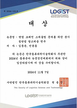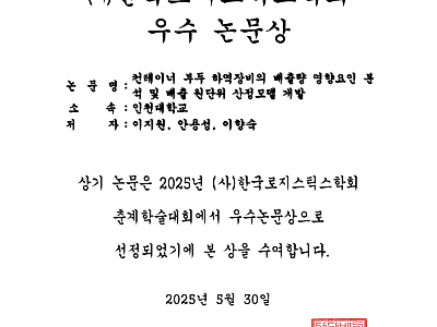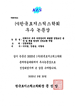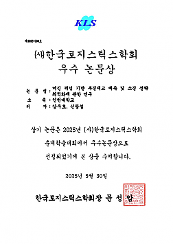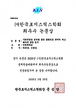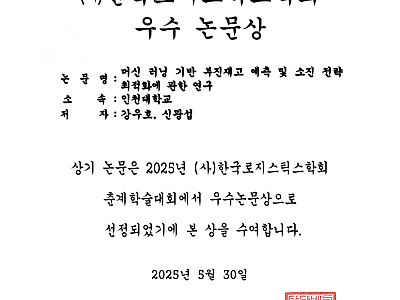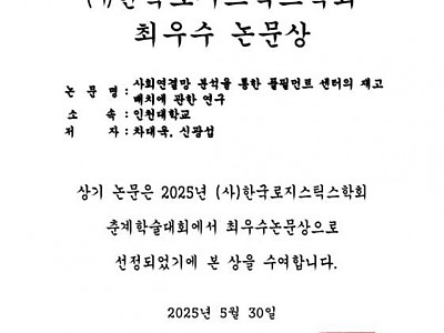 2025.06.12(사) 한국로지스틱스학회 최우수 논문상 논문명 : 사회연결망 분석을 통한 풀필먼트 센터의 재고 배치에 관한 연구 저 자 : 차대욱(박사과정), 신광섭(지도교수)