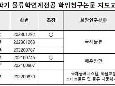 2026.04.022026학년도 1학기 물류연계전공 졸업논문 지도교수 배정 및 졸업논문 제출 안내1) 논문제출마감일: 2026. 6. 26.(금) 18시까지2) 졸업논문 지도교수 배정은 아래 확인 - 각 팀의 조장은 조원에게 연락하여 졸업논문 작성 진행해주세요 - 해당 지도교수님께 대면 또는 비대면으로 먼저 연락해서 졸업논문 작성 - 조원 개별 연락처는 032-835-8181로 문의3) 제출서류: 졸업논문(soft cover), 심사평가서, 심사평가서(개인별) ★기한내 미제출시 졸업 불가★○논문제출방법 - 첨부파일에 제시된 논문작성 양식을 기준으로 soft cover형태로 제본하여 교학과(14호관 B동 409호 물류대학원 교학행정실)에 제출 - 논문완성본 제출시에 첨부된 논문지도교수 평가의견서(팀/개별)를 같이 제출