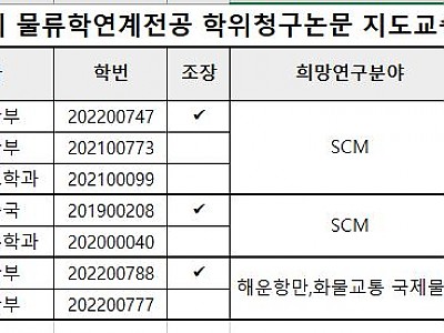 2025.10.222025학년도 2학기 물류연계전공 졸업논문 지도교수 배정 및 졸업논문 제출 안내1) 논문제출마감일: 2025. 12. 26.(금) 18시까지2) 졸업논문 지도교수 배정은 첨부파일 확인 - 각 팀의 조장은 조원에게 연락하여 졸업논문 작성 진행해주세요 - 해당 지도교수님께 대면 또는 비대면으로 먼저 연락해서 졸업논문 작성 - 조원 개별 연락처는 032-835-8181로 문의3) 제출서류: 졸업논문(soft cover), 심사평가서, 심사평가서(개인별) ★기한내 미제출시 졸업 불가★○논문제출방법 - 첨부파일에 제시된 논문작성 양식을 기준으로 soft cover형태로 제본하여 교학과(14호관 B동 409호 물류대학원 교학행정실)에 제출 - 논문완성본 제출시에 첨부된 논문지도교수 평가의견서(팀/개별)를 같이 제출