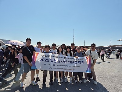 2025.11.062025 오사카 엑스포 참관1. 개요○ 일정: 2025. 9. 30.(화)~10. 2.(목)○ 장소: 일본 오사카 유메시마○ 대상: 국토교통 DNA플러스 융합기술대학원 육성사업 참여 인력2. 추진목적○ 2025 오사카 엑스포는 인공지능, 신재생에너지, 미래 모빌리티 등 차세대 기술과 지속 가능한 사회를 주제로 개최되는 전시회로서, 물류 및 운송업계가 지니고 있는 다양한 현안, 과제들을 해결하기 위한 여러 첨단 제품, 기술, 솔루션 등을 동시에 확인할 수 있음. 해당 엑스포 참관을 통해 다양한 솔루션들을 벤치마킹하여 사업단에서 추진 중인 자체 연구과제 성과물을 보완·완성하고자 함 ○ 또한 엑스포 참관을 통해 스마트 물류 실현을 위한 IoT 및 IT시스템, AI, 로봇, 물류 장비 등 최첨단 자동화 시스템의 현재와 미래를 확인하여 미래지향적인 안목을 갖게 하는 계기 마련 및 본 과제의 연구취지에 맞는 현장 적응력 있는 인력을 육성하고자 함3. 참관 사진