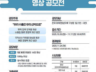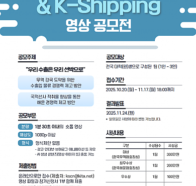 2025.12.05「K-Trade & K-Shipping 대학생 영상 공모전」※ 영상 공모전 개요 ㅇ 공모전명 : "K-Trade & K-Shipping 영상 공모전 ㅇ 주제 : ① 무역 강국 도략을 위한 수출입 물류 경쟁력 제고 방안 ② 국적선사 적취율 향상을 통한 해운 경쟁력 제고 방안 ㅇ 영상형식 : 1분 30초 이내 숏폼 영상 (AI 생성 콘텐츠 활용 가능) ㅇ 접수기간 : ~11/17(월)까지 ㅇ 상금 : 대상(300만원), 최우수상(200만원), 우수상(100만원) 등 ㅇ 제출처 : kscn@kita.net 이메일 접수 ㅇ 문의 : 한국무역협회 물류서비스실(02-6000-5359/5935)