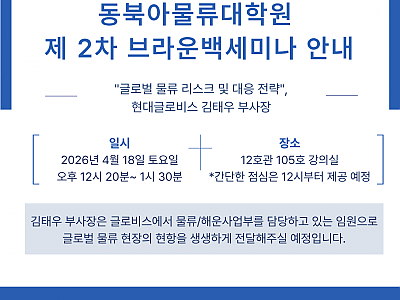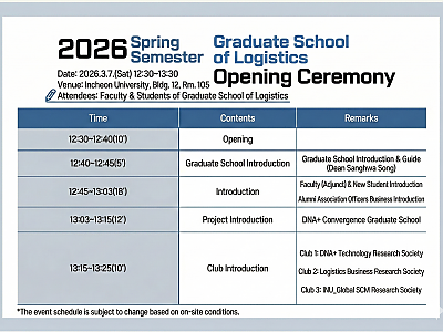 2026.03.20Spring 2026 Semester Opening Ceremony The Graduate School of Logistics will hold an Opening Ceremony for the Spring 2026 semester. On this day, both full-time and adjunct professors are scheduled to attend, and we kindly ask for the active participation of all current students. The event will be held in Room 105, Building 12. The ceremony is scheduled to begin at 12:30 PM; however, lunch (a light meal such as sandwiches or kimbap) will be provided starting at 12:00 PM. After the first class ends, students are asked to come to the venue.