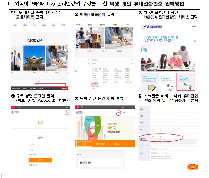 (교육) 2023학년도 외국어교육(파고다) 무료 온라인 강의 운영 작성자 관리자 작성일 2023-03-15 조회수 364 첨부파일 [붙임1] 인천대학교 ALL New 온라인 외국어과정 홍보물.pdf ( 324.2K )다운로드 [붙임2] 온라인 외국어 홈페이지 개인 휴대전화번호 입력 매뉴얼.hwt ( 2.4M )다운로드 인천대학교 외국어교육센터에서 본교 재학생을 위하 물료 온라인 외국어 교육콘텐츠를 제공하고 있으니 재학생분들은 적극 이용해주세요.