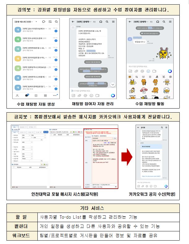 ※ 카카오워크란? - 카카오톡과 유사한 환경의 메신저 시스템으로 교수, 조교, 학생이 사용 - 강좌별 채팅방을 자동으로 생성하고 교수와 학생이 자유롭게 소통 - 학생 대상 공지 메시지를 카카오워크로 발송 |