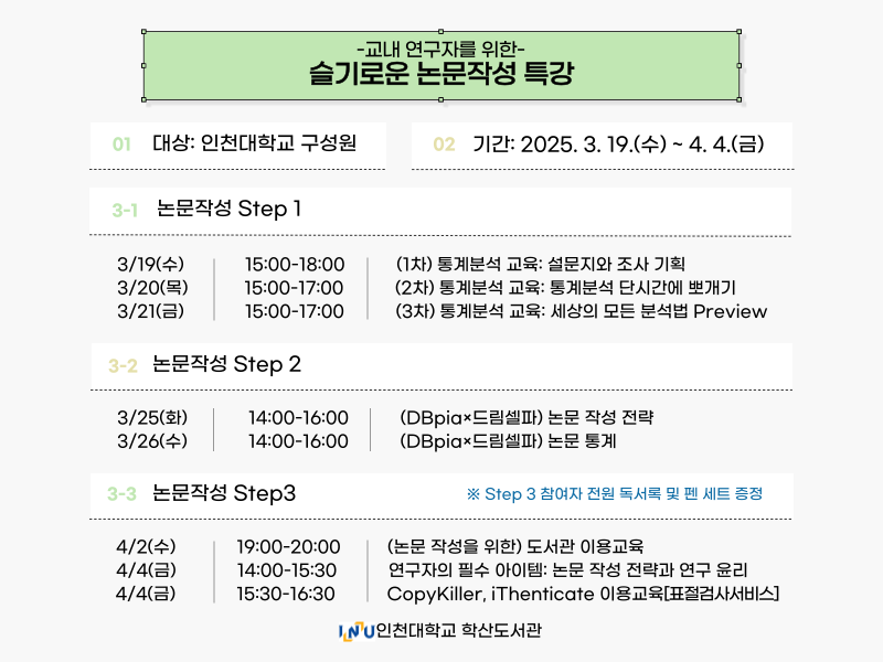 학산도서관 [슬기로운 논문작성] 특강 안내 작성자 관리자 작성일 2025-03-20 조회수 250 인천대학교 학산도서관에서 운영하는 '슬기로운 논문작성' 특강을 아래와 같이 안내합니다.*인천대학교 학산도서관 공지사항 링크: 공지사항 - 인천대학교 학산도서관