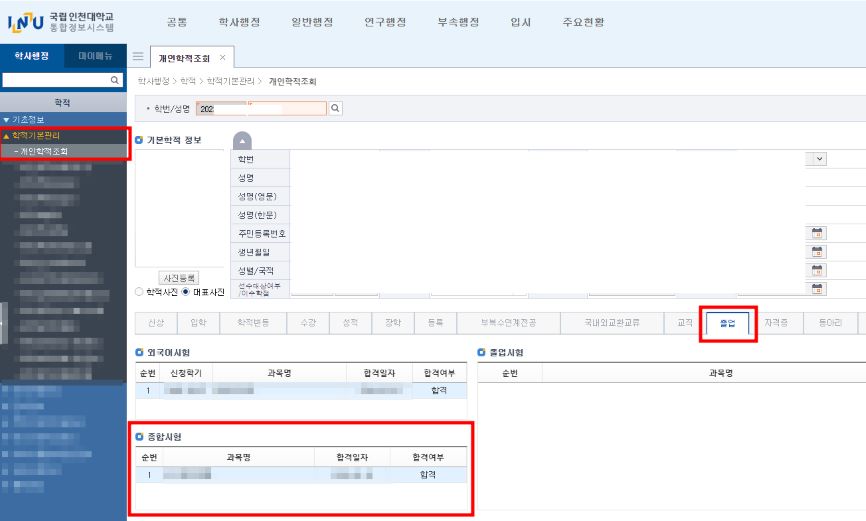 - 인천대학교 포털(통합정보시스템) -> 학사행정 -> 개인학적조회[졸업]에서 개별 확인