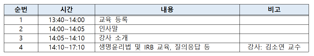 6. 내용: 생명윤리와 IRB교육(연구계획서 작성, 연구대상자 보호, 심의면제 등)