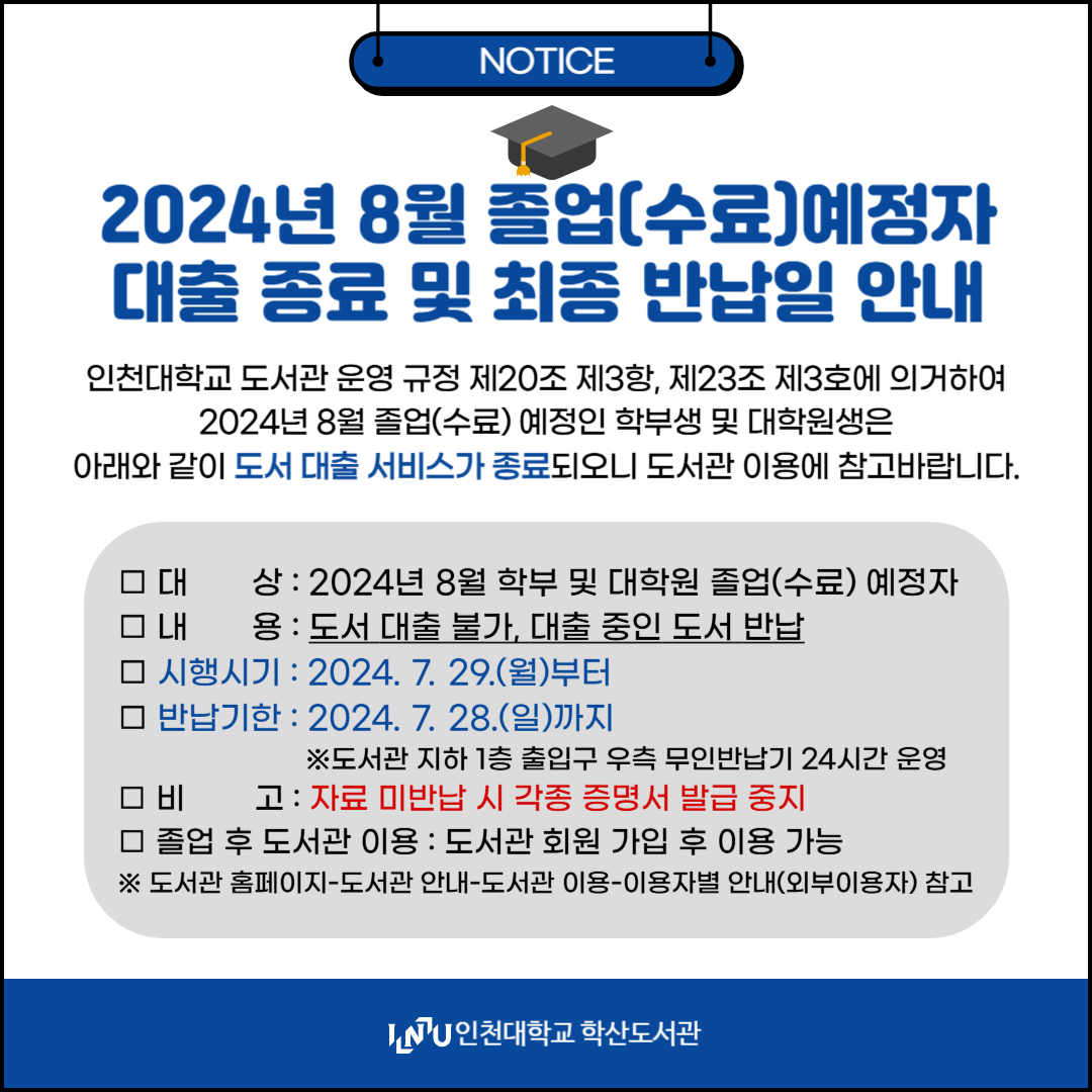 (도서관)2024년 8월 졸업(수료)예정자 대출 종료 및 최종 반납일 안내