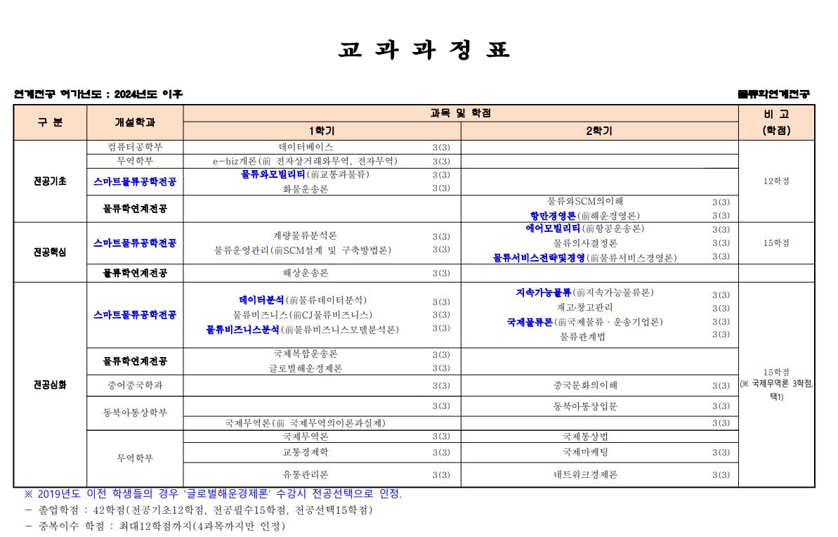 물류연계전공 학부생들은 아래 교과과정표를 토대로 수강신청 및 졸업학점 이수해 주시기 바랍니다.