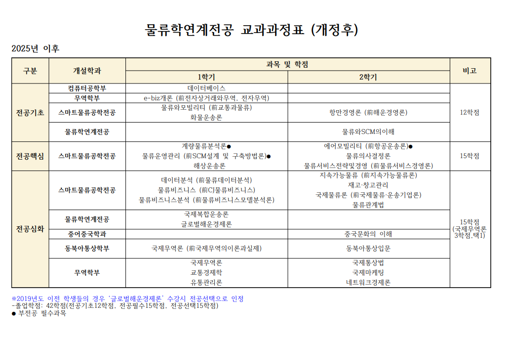 물류연계전공 학부생들은 교과과정표를 토대로 수강신청 및 졸업학점 이수해 주시기 바랍니다.