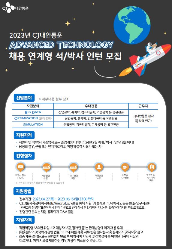 [CJ대한통운]미래기술 석/박사 인턴십(채용연계형) 모집 안내 작성자 관리자 작성일 2023-04-28 조회수 408 첨부파일 첨부1. 미래기술 석박사 인턴모집 __.pdf ( 685.7K )다운로드 첨부2. CJ_Logistics_LeafletTESC.pdf ( 1.2M )다운로드