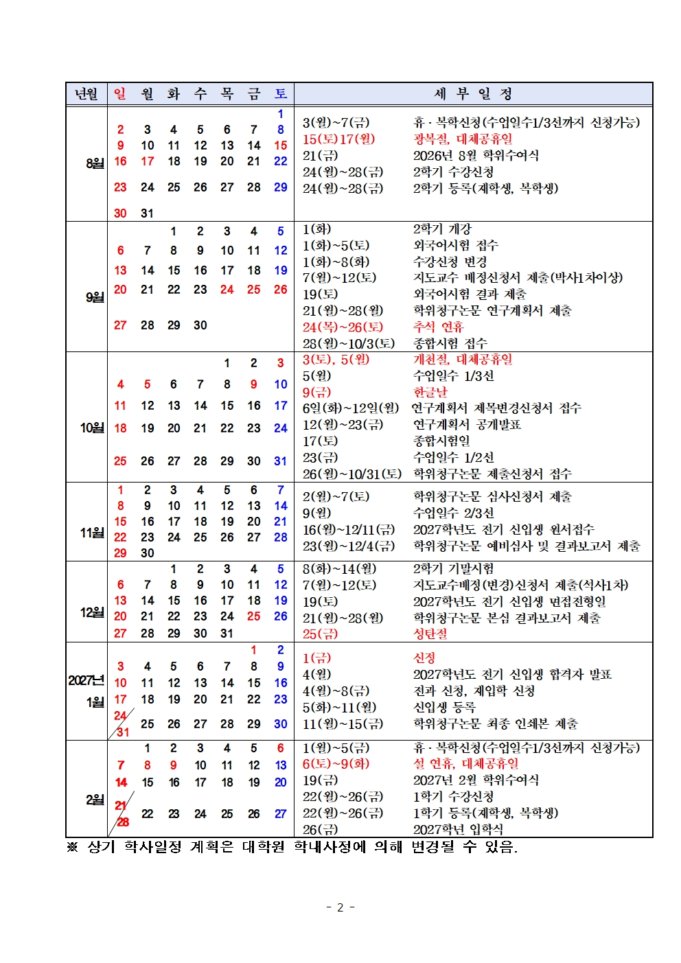 【2026 GSL Academic Year – Academic Affairs Schedule】