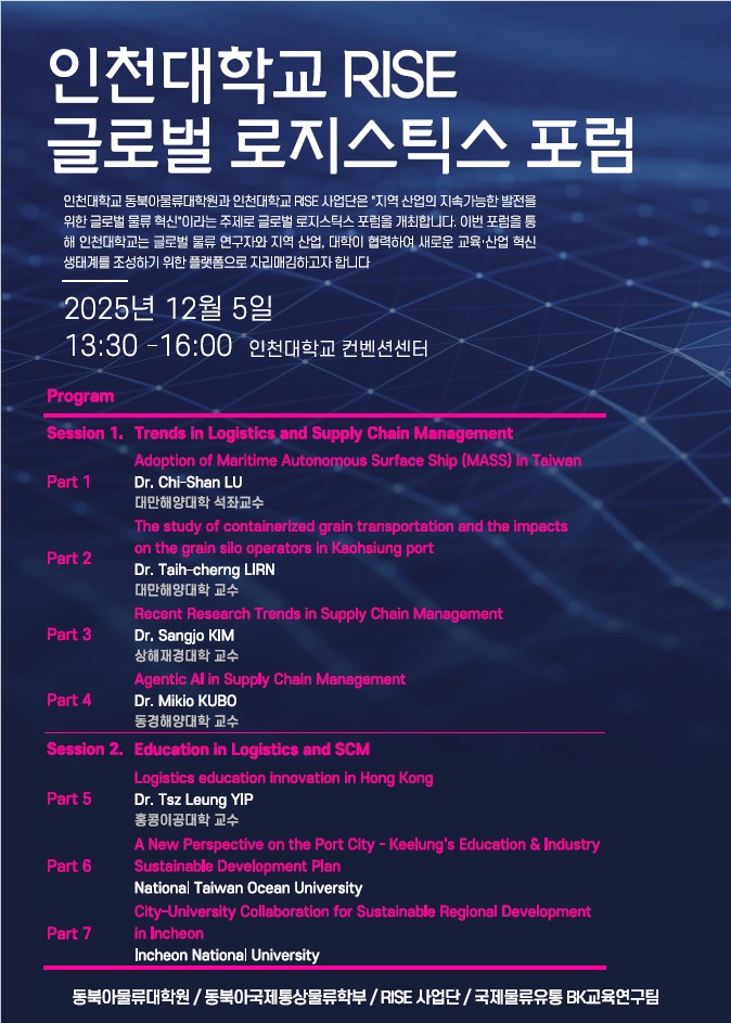 인천대학교 동북아물류대학원과 인천대학교 RISE 사업단은 "지역 산업의 지속가능한 발전을 위한 글로벌 물류 혁신" 이라는 주제로 글로벌 로지스틱스 포럼을 개최합니다.