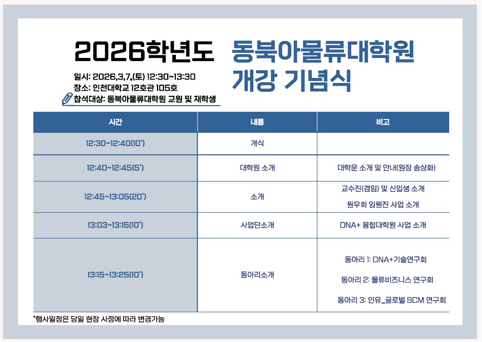 동북아물류대학원에서 2026학년도 1학기 개강 기념식을 개최하고자 합니다.