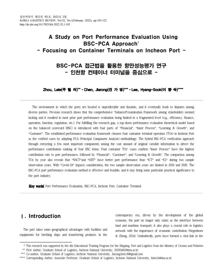 A Study on Port Performance Evaluation Using BSC-PCA Approach - Focusing on Container Terminals on Incheon Port - 작성자 관리자 작성일 2023-02-23 조회수 82 저자 주럴러, 진가영, 이향숙 학술지명 물류학회지 게재년도 2022 링크 https://scholar.kyobobook.co.kr/article/detail/4010028833953