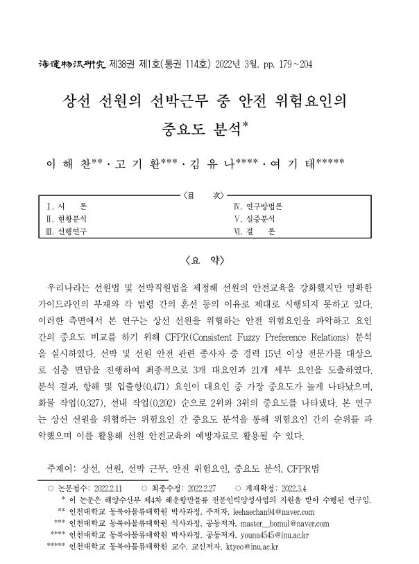 상선 선원의 선박근무 중 안전 위험요인의 중요도 분석 작성자 관리자 작성일 2023-02-23 조회수 77 저자 이해찬,고기환,김유나,여기태 학술지명 해운물류연구 게재년도 2022 링크 https://kiss.kstudy.com/thesis/thesis-view.asp?key=3938955