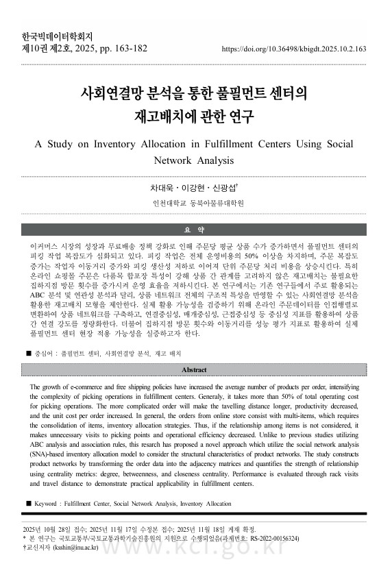 사회연결망 분석을 통한 풀필먼트 센터의 재고배치에 관한 연구 작성자 관리자 작성일 2026-02-04 조회수 80 저자 차대욱,이강현,신광섭 학술지명 한국빅데이터학회 학회지 게재년도 2025 링크 https://www.kci.go.kr/kciportal/landing/article.kci?arti_id=ART003273886 사회연결망 분석을 통한 풀필먼트 센터의 재고배치에 관한 연구