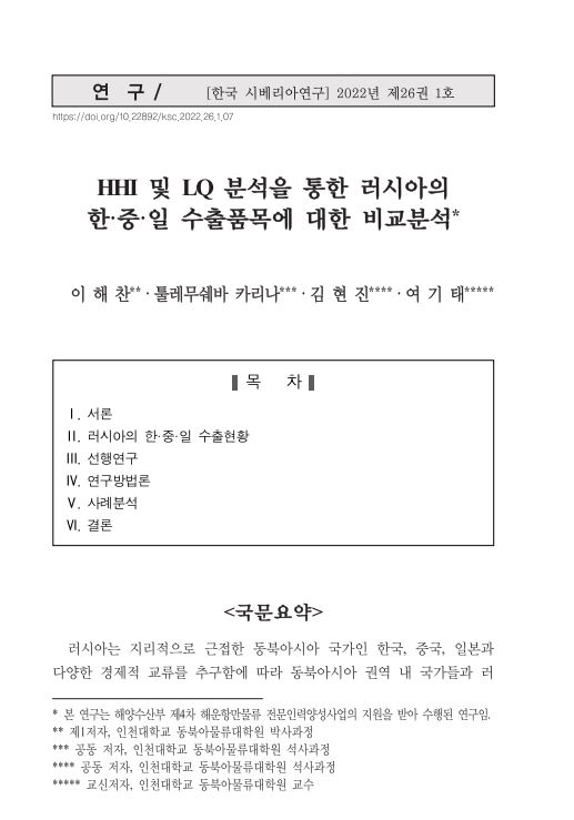 HHI 및 LQ 분석을 통한 러시아의 한·중·일 수출품목에 대한 비교분석 작성자 관리자 작성일 2023-02-23 조회수 81 저자 이해찬,툴레무쉐바카리나,김현진,여기태 학술지명 한국시베리아연구 게재년도 2022 링크 https://kiss.kstudy.com/thesis/thesis-view.asp?key=3939498