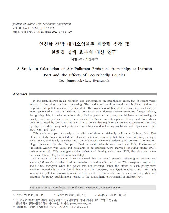 인천항 선박 대기오염물질 배출량 산정 및 친환경 정책 효과에 대한 연구 작성자 관리자 작성일 2023-02-23 조회수 96 저자 이정욱,이향숙 학술지명 한국항만경제학회지 게재년도 2022 링크 https://www.dbpia.co.kr/pdf/pdfView.do?nodeId=NODE11064586&googleIPSandBox=false&mark=0&ipRange=false&accessgl=Y&language=ko_KR&hasTopBanner=true