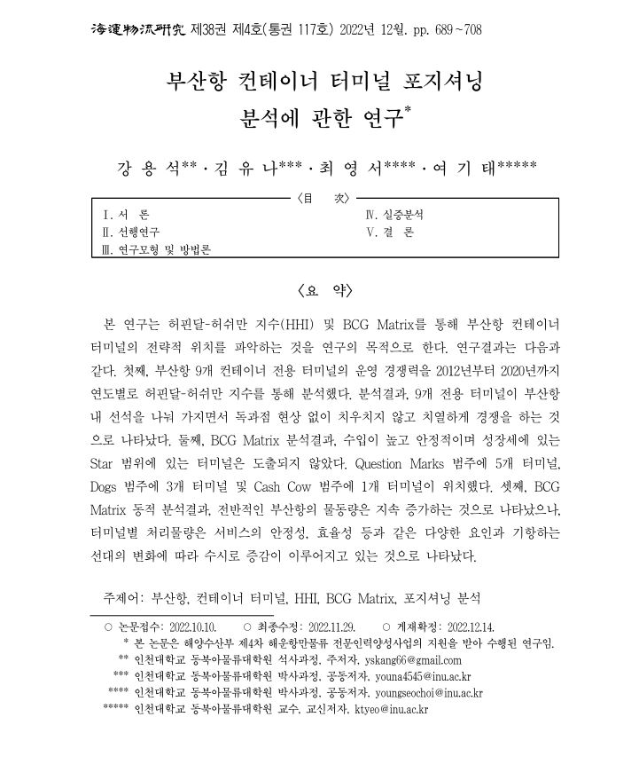 부산항 컨테이너 터미널 포지셔닝 분석에 관한 연구 작성자 관리자 작성일 2023-03-16 조회수 114 저자 강용석,김유나,최영서,여기태 학술지명 해운물류연구 게재년도 2022 링크 https://kiss.kstudy.com/Detail/Ar?key=3994874