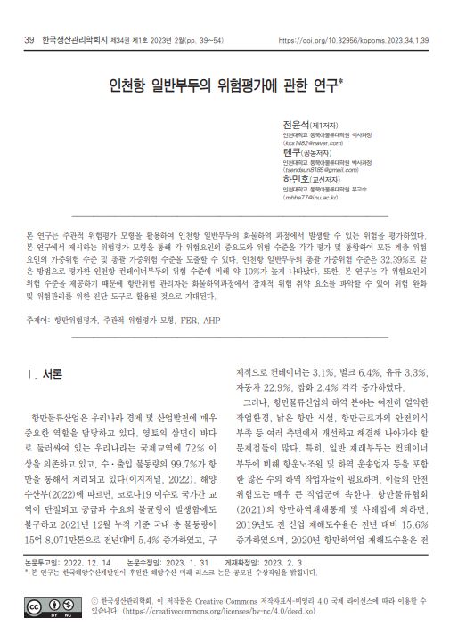 인천항 일반부두의 위험평가에 관한 연구 작성자 관리자 작성일 2023-09-08 조회수 85 저자 전윤석,텐쿠,하민호 학술지명 한국생산관리학회지 게재년도 2023 링크 https://scholar.kyobobook.co.kr/article/detail/4010037120648