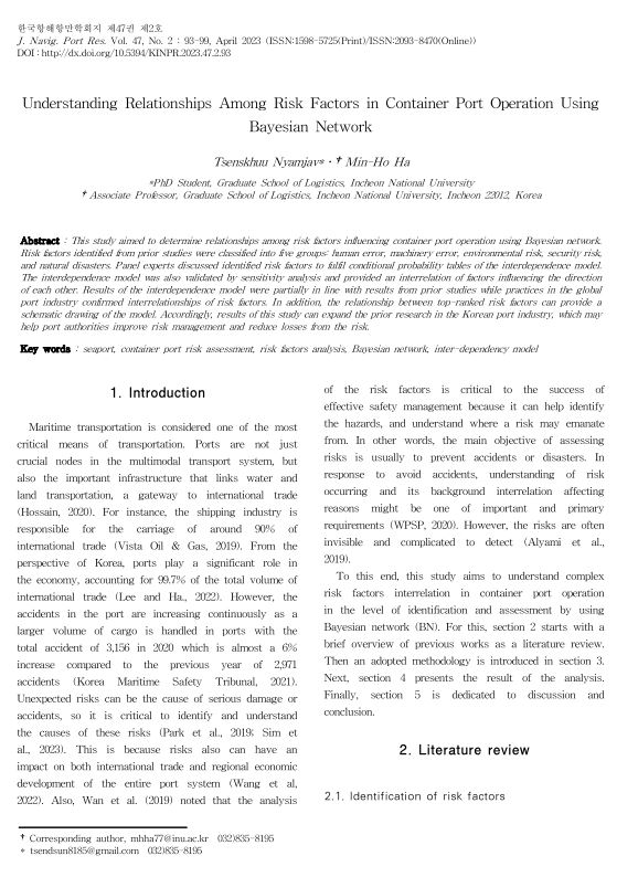 Understanding Relationships Among Risk Factors in Container Port Operation Using Bayesian Network 작성자 관리자 작성일 2023-09-08 조회수 138 저자 텐쿠,하민호 학술지명 한국항해항만학회지 게재년도 2023 링크 https://scholar.kyobobook.co.kr/article/detail/4010047397038
