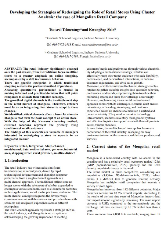 Developing the Strategies of Redesigning the Role of Retail Stores Using Cluster Analysis: The Case of Mongolian Retail Company 작성자 관리자 작성일 2023-09-08 조회수 442 저자 Tsatsral, 신광섭 학술지명 한국경영정보학회 게재년도 2023 링크 https://www.earticle.net/Article/A434314
