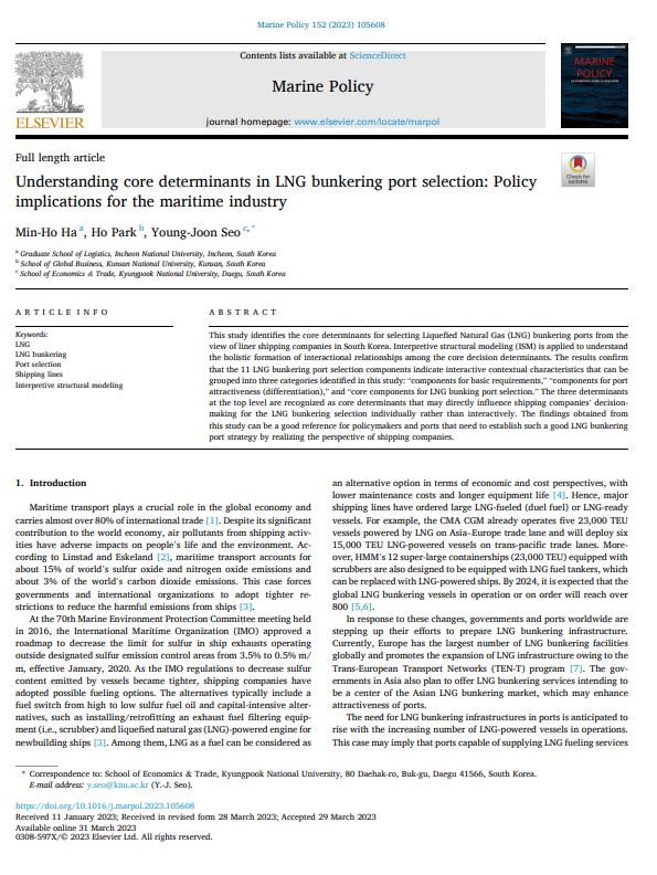 Understanding core determinants in LNG bunkering port selection: Policy implications for the maritime industry 작성자 관리자 작성일 2023-09-08 조회수 523 저자 하민호 학술지명 Marine Policy 게재년도 2023 링크 https://www.sciencedirect.com/science/article/pii/S0308597X23001355