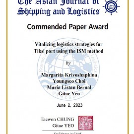 【2023 ICASL Commended Paper Award 수상】 논 제 : Vitalizing logistics strategies for Tiksi port using the ISM method 저 자 : (박사과정) Youngseo Choi, Maria Listan Bernal 지도교수 : 여기태
