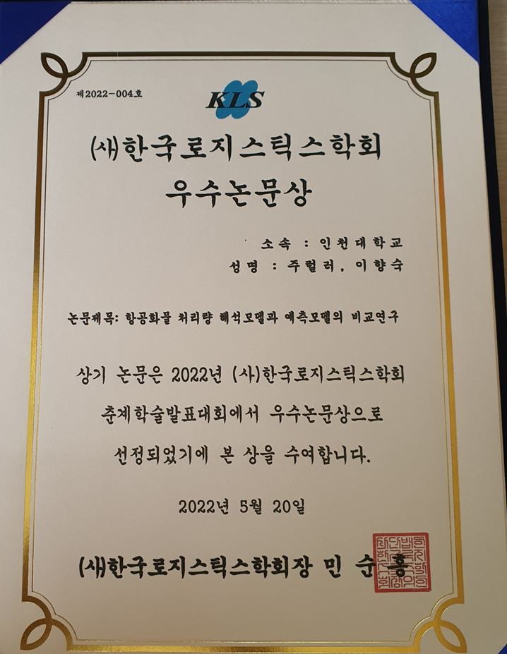 (사)한국로지스틱스학회 우수논문상 수상